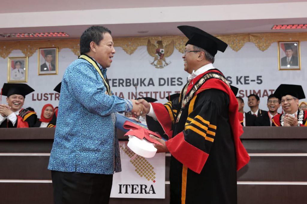 Lampung Selatan -Gubernur Lampung, Arinal Djunaidi dan 7 pendiri Institut Teknologi Sumatera (ltera) menerima penghargaan dalam acara Sidang Terbuka Dies Natalis Ke-5 dan Lustrum Perdana Institut Teknologi Sumatera (ltera), Lampung Selatan, Senin (7/10/2019).