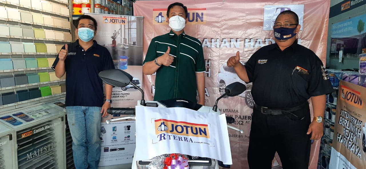 Bandarlampung– Noverisman Subing pelanggan Toko Jotun Multicolor Terra Jl Teuku Umar Bandarlampung, meraih hadiah satu unit sepeda motor dari undian Jotun Berkah Berlimpah Rejeki Hari Raya.