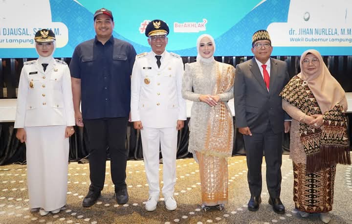 Jakarta — Gubernur Lampung, Rahmat Mirzani Djausal, didampingi Wakil Gubernur Lampung, Jihan Nurlela, melaksanakan serah terima jabatan Gubernur dan Bupati/Walikota se-Provinsi Lampung, di Movenpick Hotel Jakarta, Kamis (20/2/2025).
