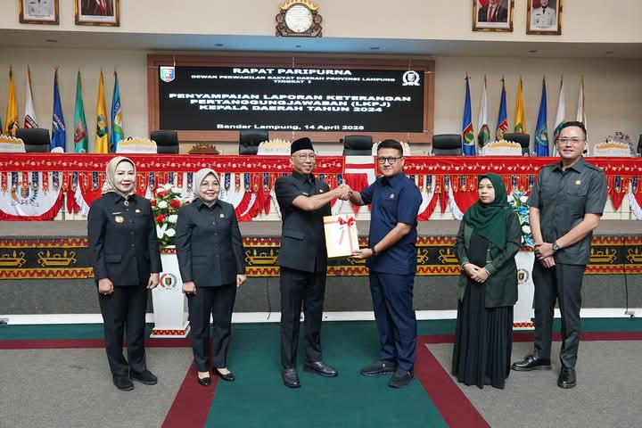 Bandar Lampung — Gubernur Lampung Rahmat Mirzani Djausal menyampaikan Laporan Keterangan Pertanggungjawaban (LKPJ) Kepala Daerah Tahun Anggaran 2024 dalam Rapat Paripurna DPRD Provinsi Lampung yang digelar di Ruang Sidang Paripurna, Senin (14/4/2025).