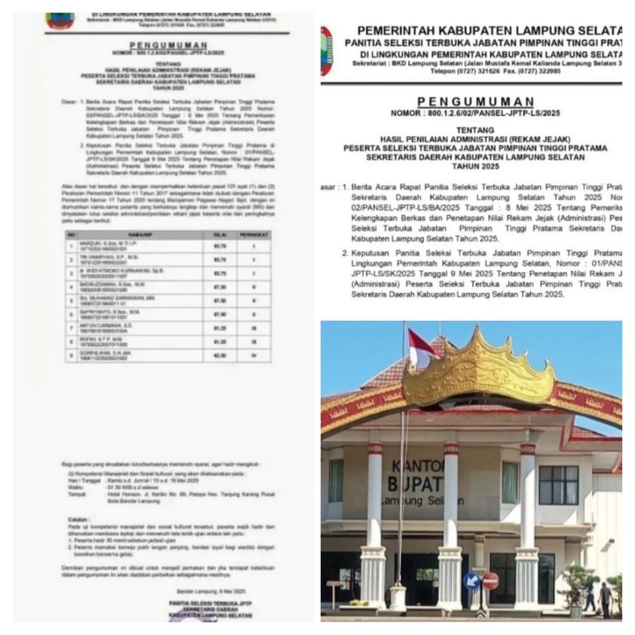 Panitia Seleksi Terbuka Jabatan Pimpinan Tinggi Pratama (JPTP) Sekretaris Daerah Kabupaten Lampung Selatan resmi mengumumkan hasil penilaian administrasi (rekam jejak) seleksi terbuka tahun 2025. Tiga peserta meraih nilai tertinggi dengan skor identik, yakni 93,75, menempatkan mereka pada peringkat teratas dalam seleksi ini.