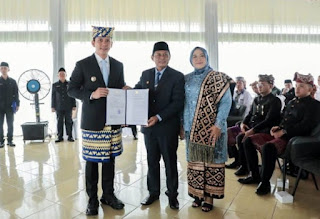 Mengenakan stelan jas hitam-biru dengan balutan aksesoris pakaian adat Lampung, tampak Bupati Egi secara langsung memimpin pembacaan naskah sumpah jabatan.