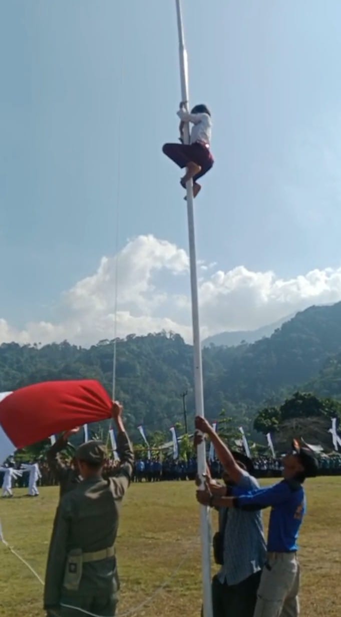 Dalam prosesi tersebut, tali pengikat bendera tiba-tiba terputus dan tersangkut di puncak tiang, membuat jalannya upacara sempat terganggu. Situasi itu sontak menimbulkan kecemasan di antara peserta dan panitia. Namun, seorang siswa sekolah dasar dengan sigap mengambil inisiatif.