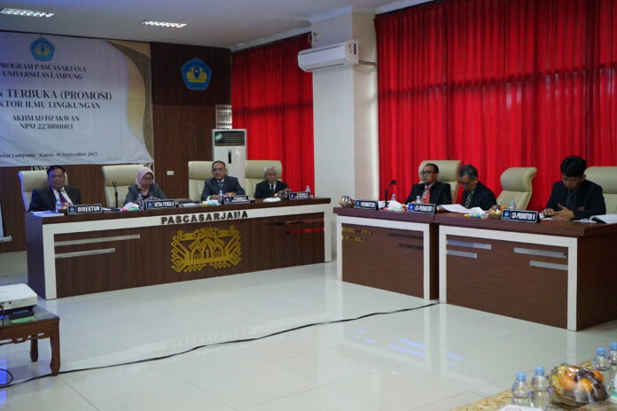 Ujian terbuka yang berlangsung khidmat ini menandai keberhasilan Akhmad Dzakwan meraih gelar doktor Ilmu Lingkungan dari Pascasarjana Unila.