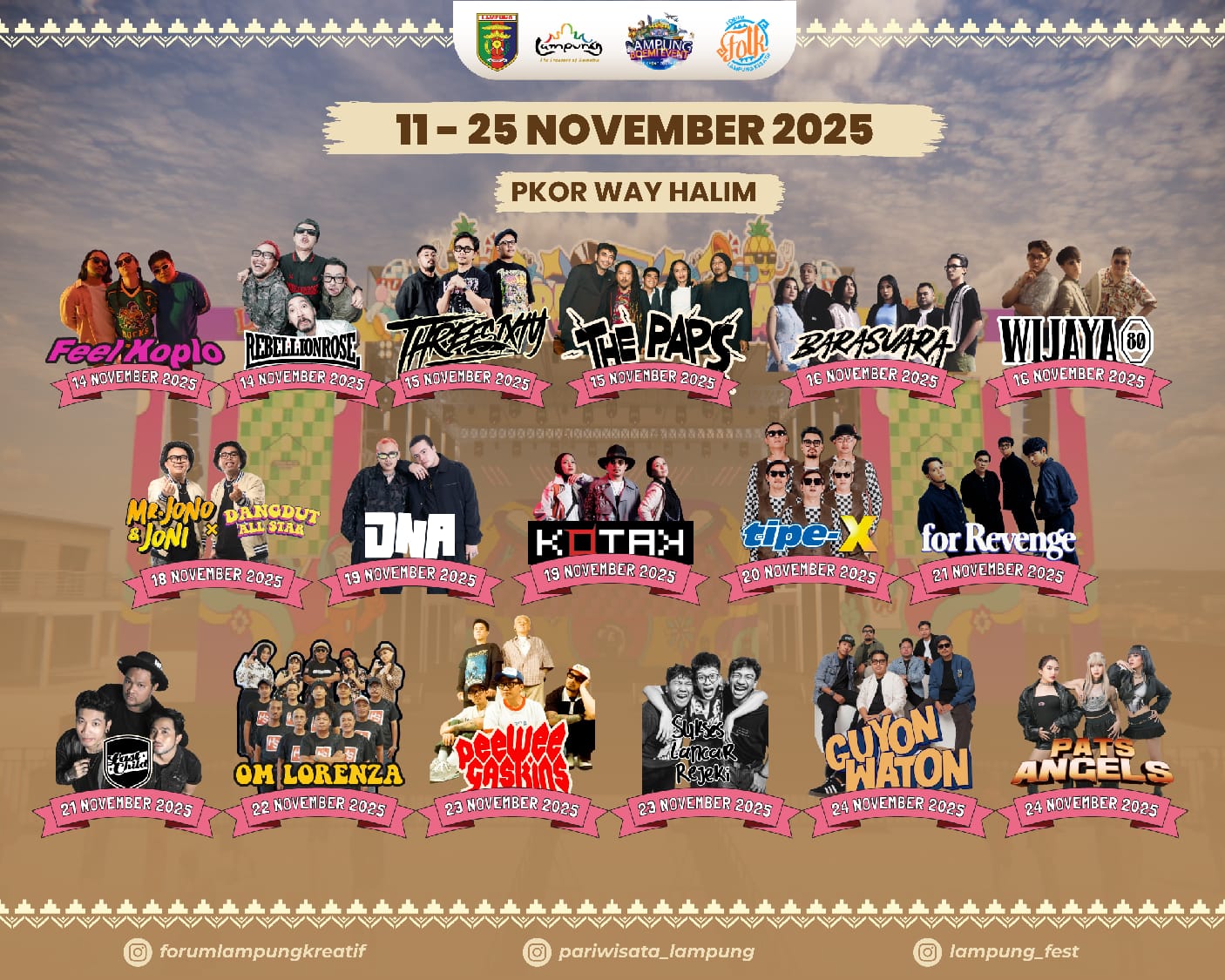 Sejumlah band nasional lintas genre dijadwalkan tampil, mulai dari musik koplo hingga pop alternatif. Di antara nama besar yang akan hadir: Feel Koplo dan Rebellion Rose (14 November), Threesixty dan The Paps (15 November), Barasuara dan Wijaya80 (16 November), Jono Joni + Dangdut All Star (18 November), DNA dan Kotak (19 November), Tipe-X (20 November), for Revenge dan Lastchild (21 November), Om Lorenza (22 November), Peewee Gaskins dan Sukses Lancar Rejeki (23 November), serta Guyon Waton dan Pats Angels (24 November).