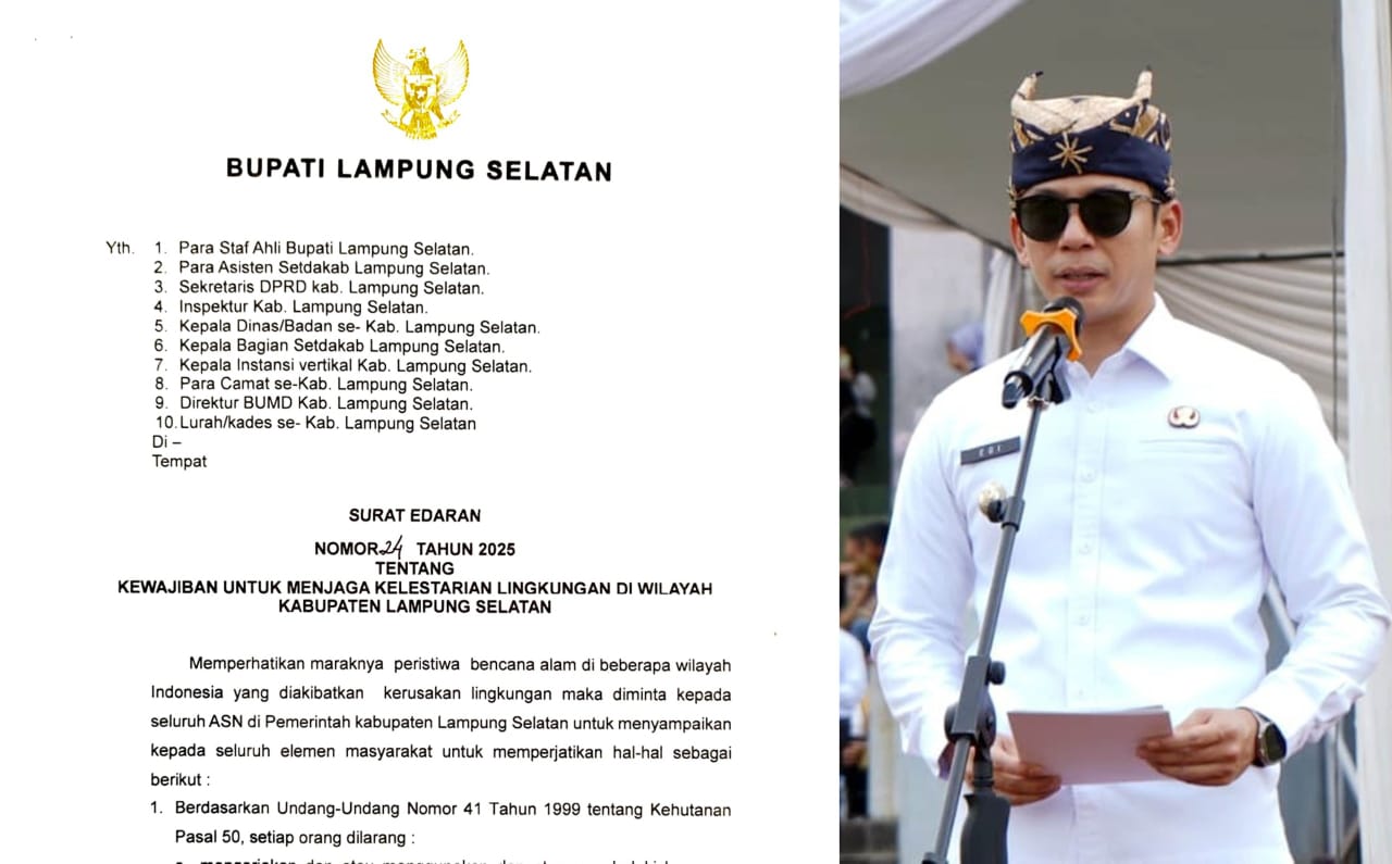 LAMSEL, Kalianda – Bupati Lampung Selatan, Radityo Egi Pratama, resmi mengeluarkan Surat Edaran Nomor 24 Tahun 2025 tentang Kewajiban Menjaga Kelestarian Lingkungan Hidup di wilayah Kabupaten Lampung Selatan.