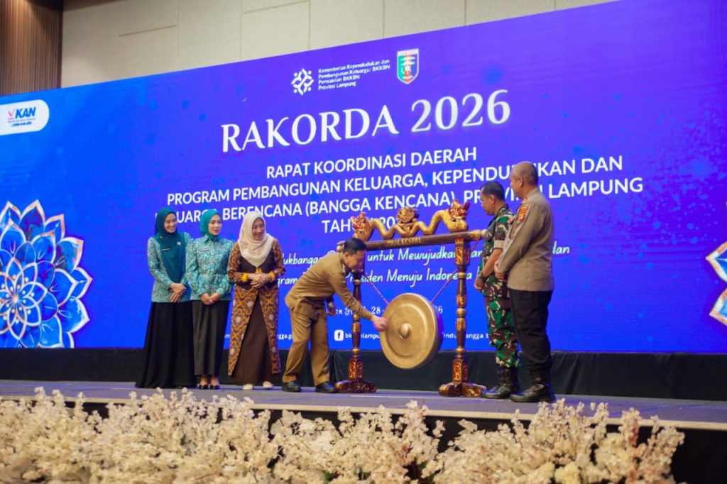 Apresiasi diserahkan oleh Kepala Perwakilan BKKBN Provinsi Lampung, Soetriningsih, kepada Pemerintah Provinsi Lampung yang diwakili oleh Ketua TP PKK Provinsi Lampung Purnama Wulan Sari, dalam kegiatan Rapat Koordinasi Daerah (Rakorda) Program Bangga Kencana Provinsi Lampung Tahun 2026 di Hotel Radisson, Selasa (28/04/2026).
